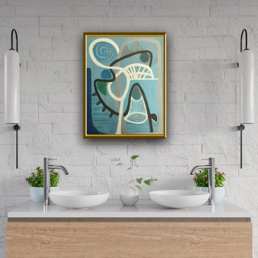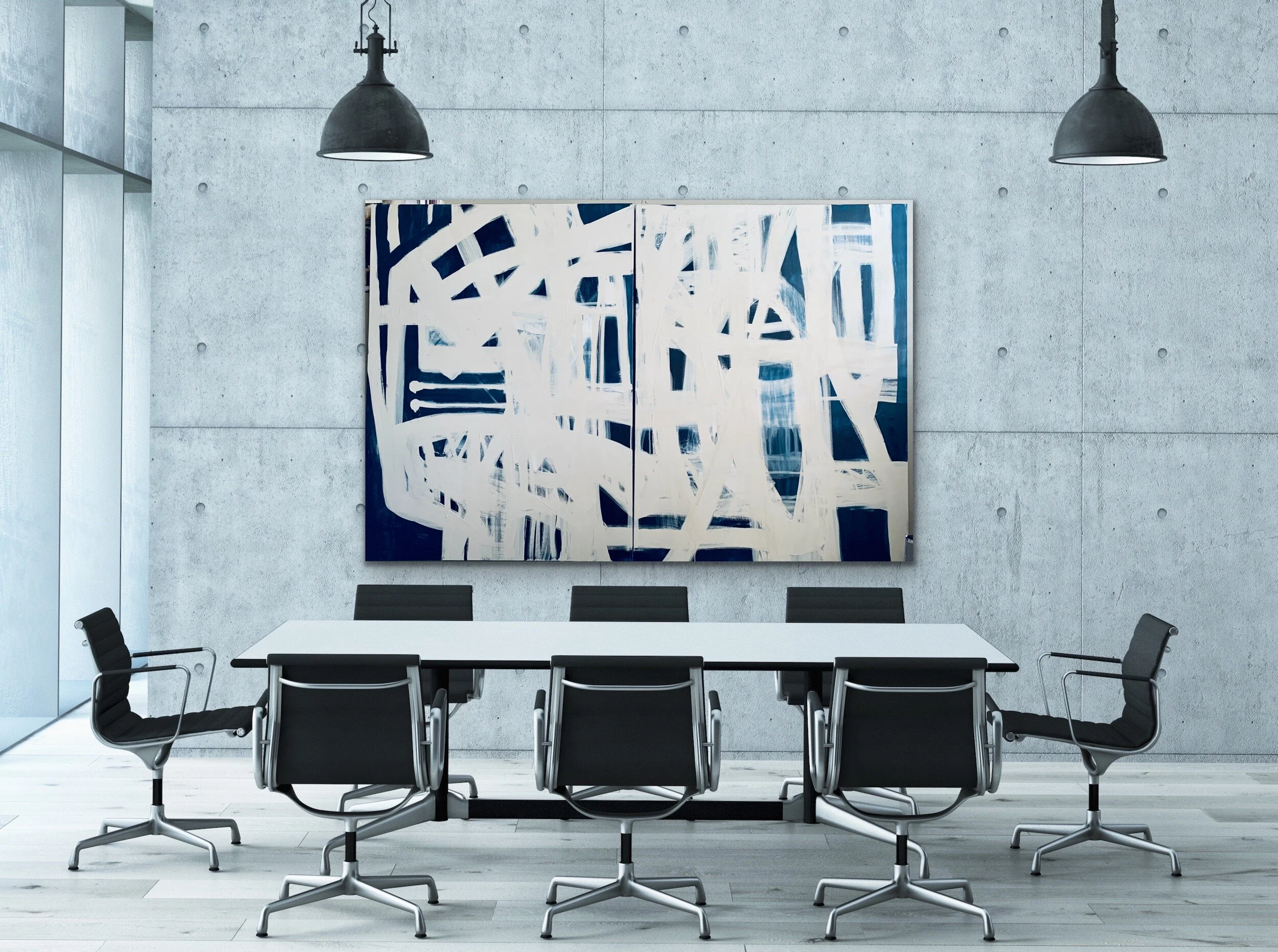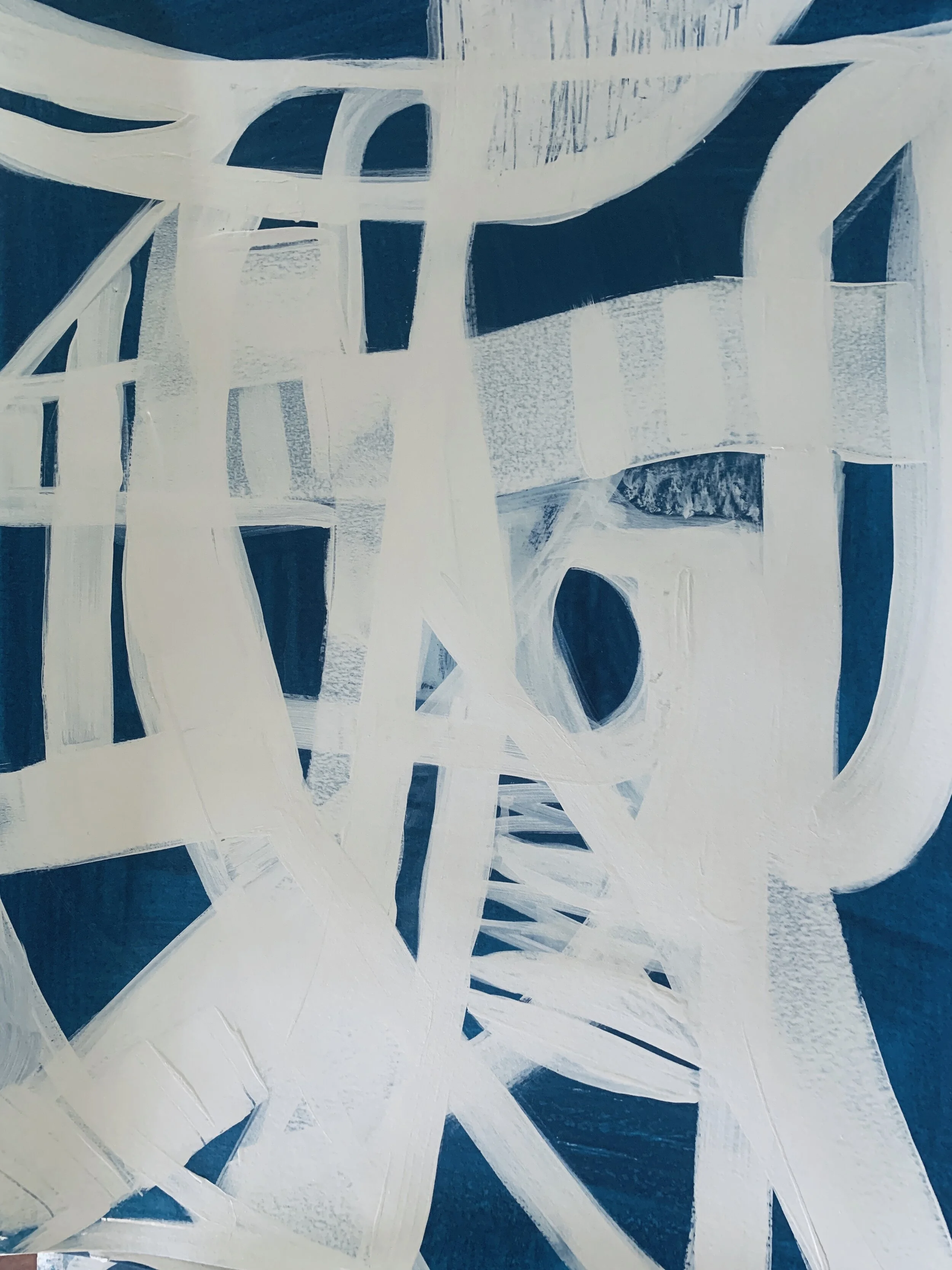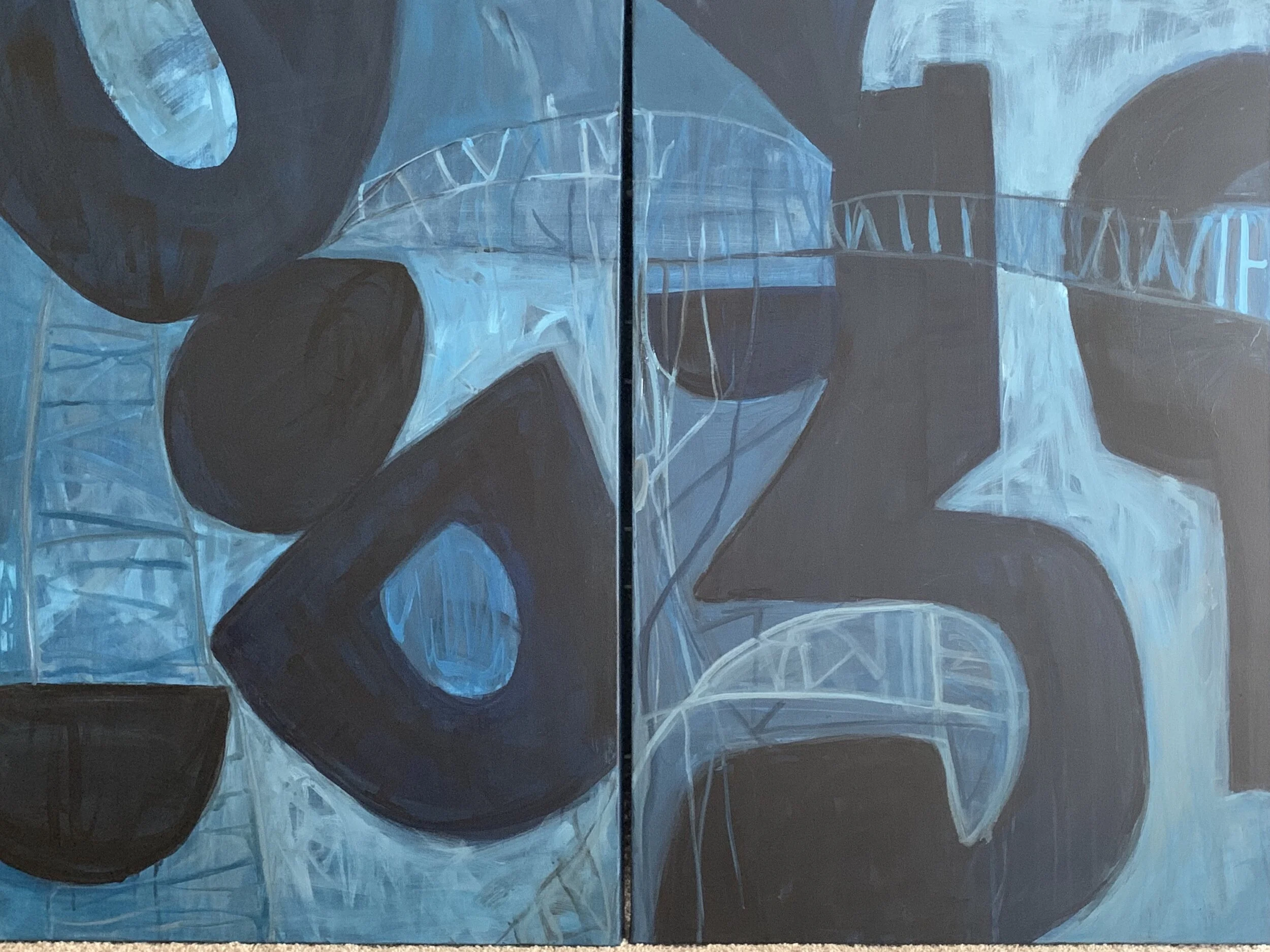 The works in this group were created with a limited palette based on black, white, and blues and may be interpreted as abstract blueprints of the various paths that diagram the internal and external byways of daily life; elements of such as maps, architecture, landscape design, bridges, road signs, and highway flyovers shift into biomorphic and alphanumeric lines, circuits, mazes, and shapes. These are laid on a field of blue paint derived from copper, which itself represents connectivity, and draw the eye into a meander across the surface of the painting.